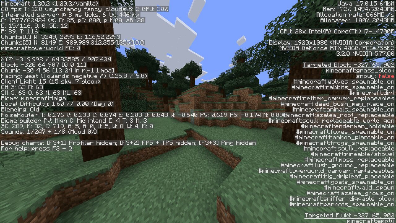 ちなみに、アップデート前(1.21.8以前)のデバッグ画面はデフォルトだとこんな感じで表示される要素が滅茶苦茶多かったです。